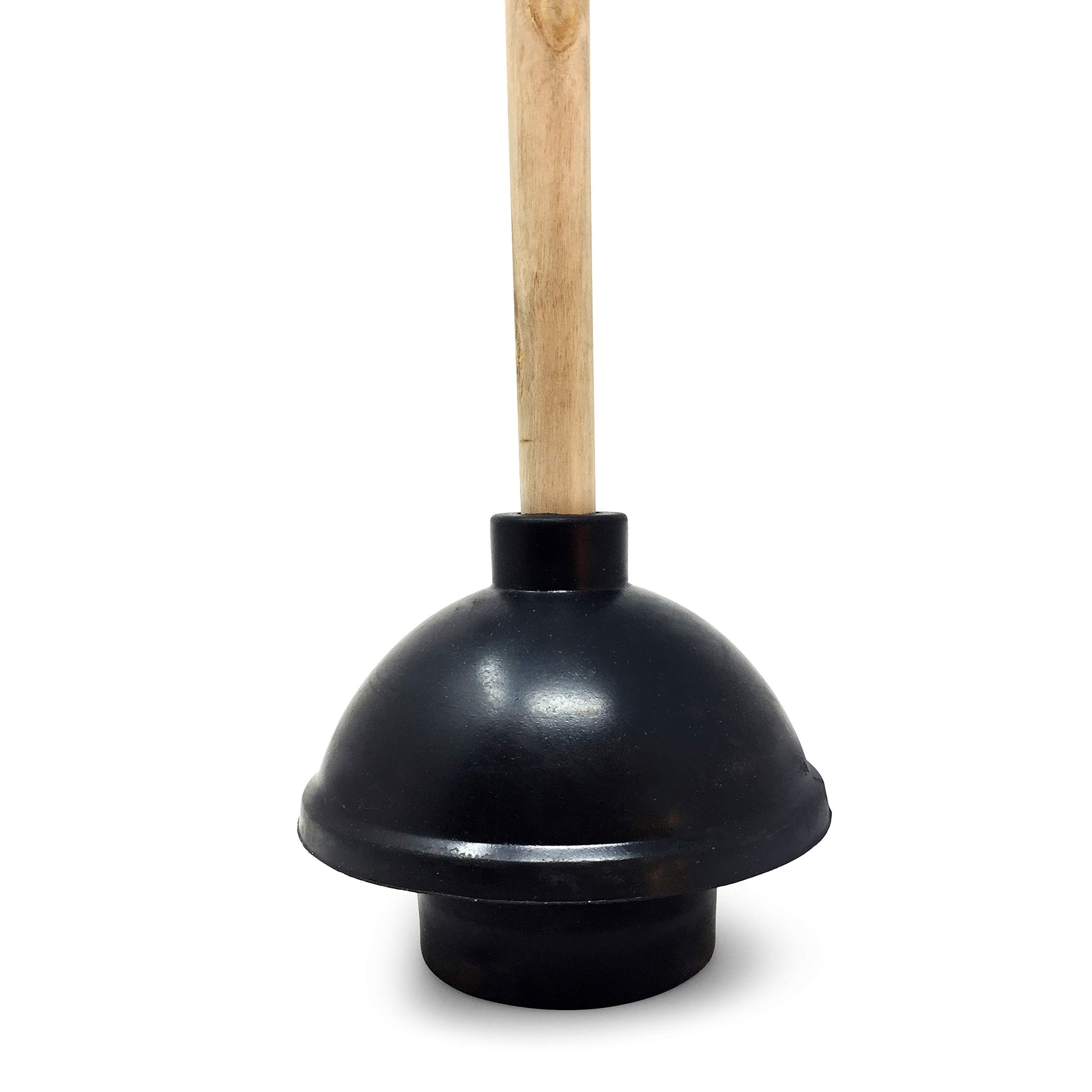 Premier plunger with a 19 in wooden handle and large rubber cup for unclogging drains and toilets.
